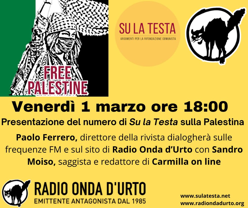 Venerdi 1 Marzo 2024 ore 18 sulle frequenze di Radio Onda d’Urto presentazione del nuovo numero di “Su la Testa” sulla Palestina con Paolo Ferrero Direttore della Rivista e Sandro Moiso Saggista e Redattore di Carmilla online.