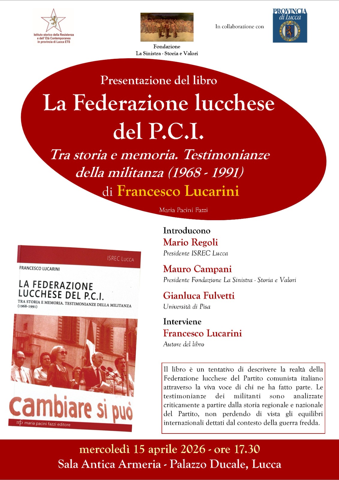 - Mercoledi 15 Aprile 2026 ore 17,30 presentazione del libro: “La Federazione Lucchese del PCI”