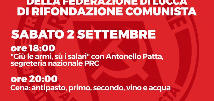Festa di Rifondazione Federazione di Lucca Sabato 02 Settembre dalle ore 18 incontro con Antonello Patta “Giu’ le Armi,Su i Salari”. Alle ore 20 Cena....