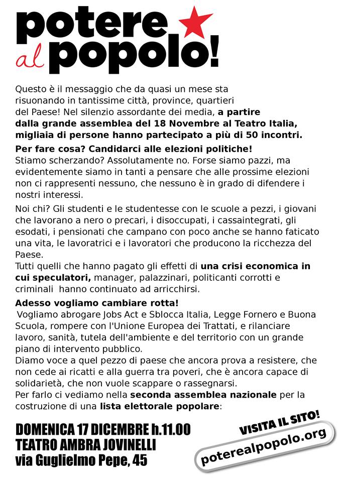 Per l’autofinanziamento delle spese si può sottoscrivere (l’affitto del teatro costa 4.880 euro): https://poterealpopolo.org/sostieni-potere-al-popolo/